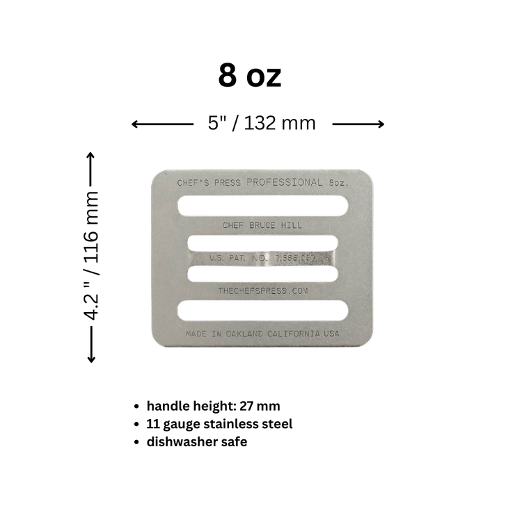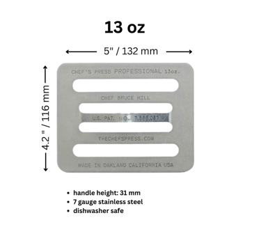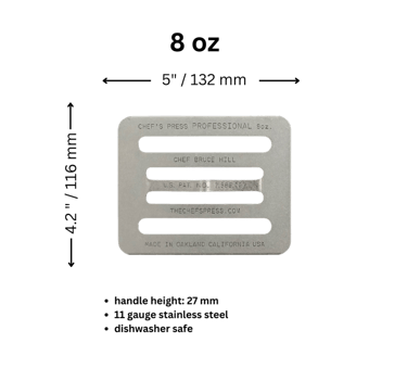 The original Chef’s Press, an 8oz. weight, was designed to be stacked. You can use up to six presses, totaling 48oz or 3lbs, for various weight combinations: one press at 8oz, two at 16oz, and so forth. These 8oz. presses can be stacked or arranged in a staggered manner to cover larger items.