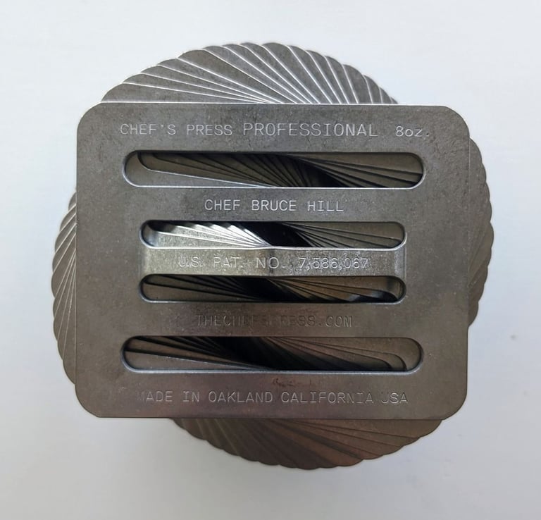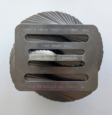 In 2017, Chef Hill began producing the Chef's Press Professional line in Oakland California. The new version is made from USA-forged steel and sourced from Mid-American Stainless in Cleveland, OH. The steel is stamped into the Chef's Press by Rago & Son in Oakland, using a 100-ton press, just the way Rago has stamped steel since 1945. The custom tooling was designed and built by Precision Metal Tooling, Inc. in Oakland. The presses are then de-burred by DougCo in Oakland. The de-burring removes most of the rough edges caused by the stamping process. Lastly, Chef Hill drives the presses to his workshop in San Francisco, where each press is personally inspected by Chef Hill himself.