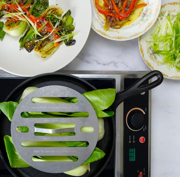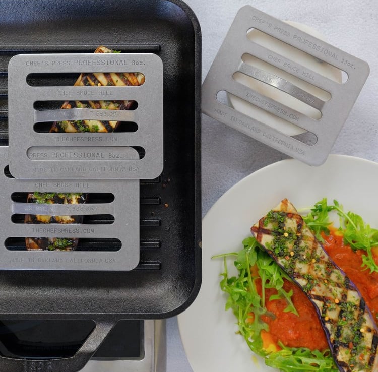 The Chef’s Press was born out of true necessity in the tiny kitchen of Bix Restaurant down a secret alley in San Francisco, where Chef Bruce Hill was at the helm of the stoves. In a small kitchen like that, every second counts. The old cast iron bacon presses used by his cooks trapped steam and were too heavy for many dishes. In 2004, Chef Hill created The Chef’s Press – a weight-adjustable tool that allows food to cook 20-30% faster and is vented to release moisture, yielding better results with greater ease.