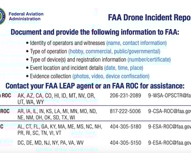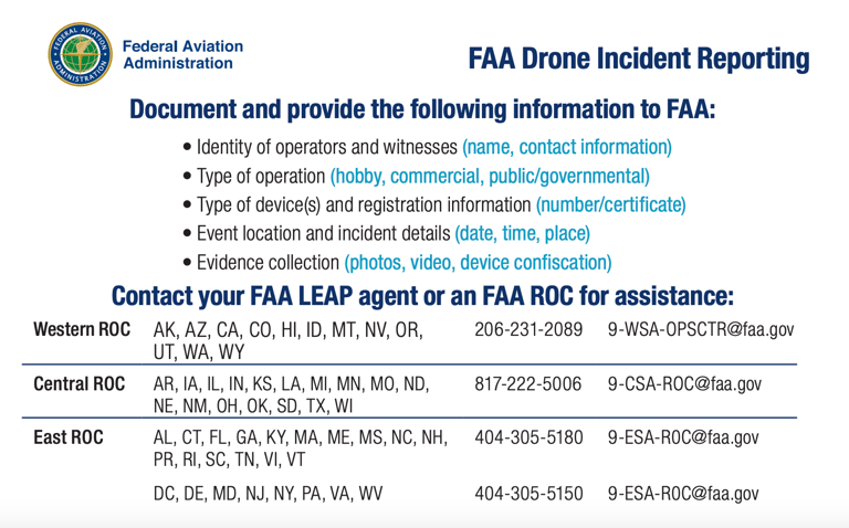 Special agents from the FAA's Law Enforcement Assistance Program (LEAP) are your point of contact for federal, state, local, tribal, territorial and international law enforcement agencies. LEAP special agents can provide information on drone enforcement and registration matters. Providing a LEAP special agent with reports of suspected unauthorized UAS incidents in a timely manner increases the FAA's ability to take enforcement action when appropriate. (NOTE: You may contact any LEAP agent if your assigned agent is not available.)