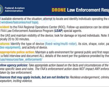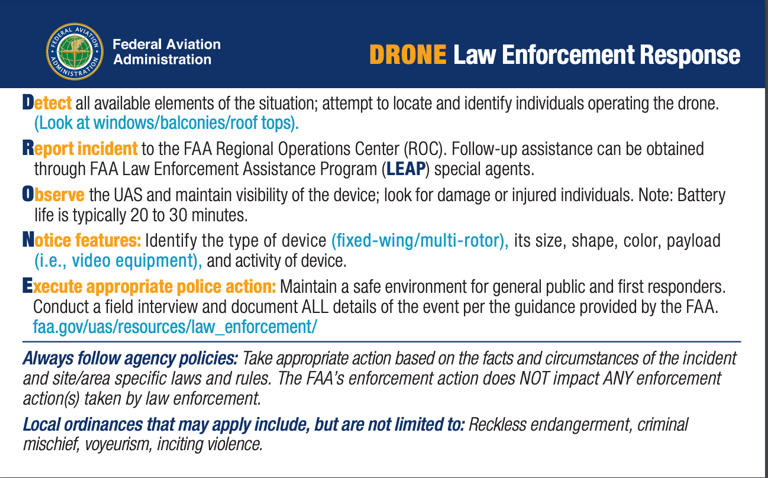 Public Safety Agencies, such as Law Enforcement, are in the best position to deter, detect, and investigate unauthorized or unsafe UAS operations. While drones can serve as a useful tool, these agencies also have an important role in protecting the public from unsafe and unauthorized drone operations. This information will help law enforcement and public safety professionals understand safe drone operations and their authority.